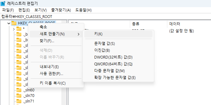2. HKEY_CLASSES_ROOT에서 마우스 오른쪽 클릭 > 새로 만들기 > 키 생성(이 키이름이 나중에 URI Scheme 명으로 사용됨). 난 testURI 이름으로 생성함